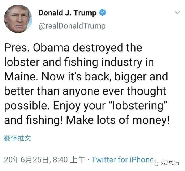 签完备忘录之后,特朗普当天特地发了条推特“表功”:“奥巴马总统毁了缅因州的龙虾业和渔业,现在它们又回来了,比任何人想象的都要大、都要好。好好地‘捕龙虾’、捉鱼吧!赚大钱!”。