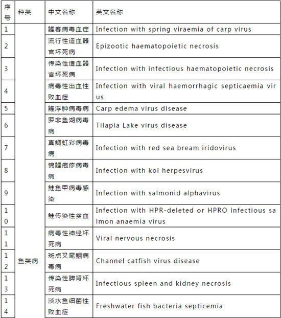 修订后的《名录》,包括水生动物疫病43种,均被列为二类进境疫病。新增了7种水生动物疫病,分别为:鲑鱼甲病毒感染、鲤浮肿病毒病、罗非鱼湖病毒病、细菌性肾病、急性肝胰腺坏死、十足目虹彩病毒1感染(虾虹彩病毒病)和蝾螈弧菌感染;删除了8种水生动物疫病,分别为:对虾杆状病毒病、斑节对虾杆状病毒病、小瓜虫病、黏孢子虫病、 指环虫病、河蟹颤抖病 、鲍脓疱病和鳖腮腺炎病。