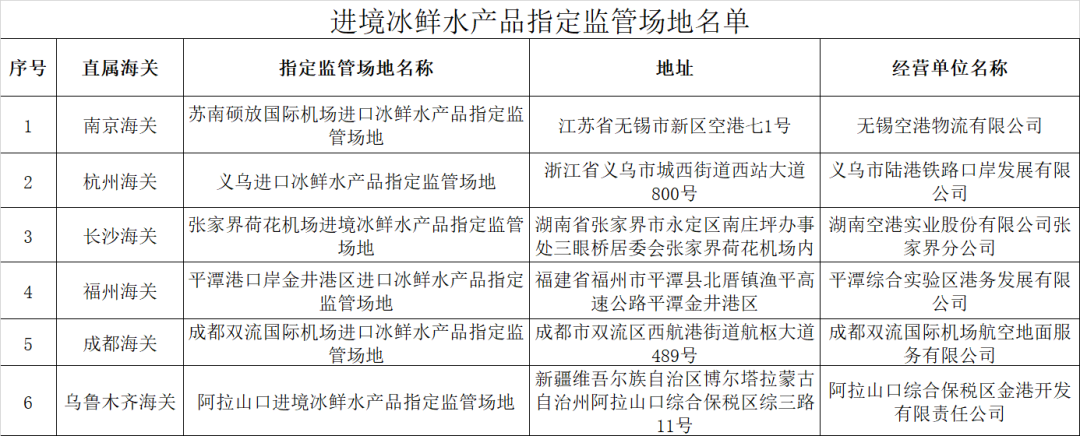加上2019年已有的:直属南京海关的苏南硕放国际机场进口冰鲜水产品指定监管场地和直属杭州海关的义乌进口冰鲜水产品指定监管场地,总计6家。具体地址和经营单位如下图所示。