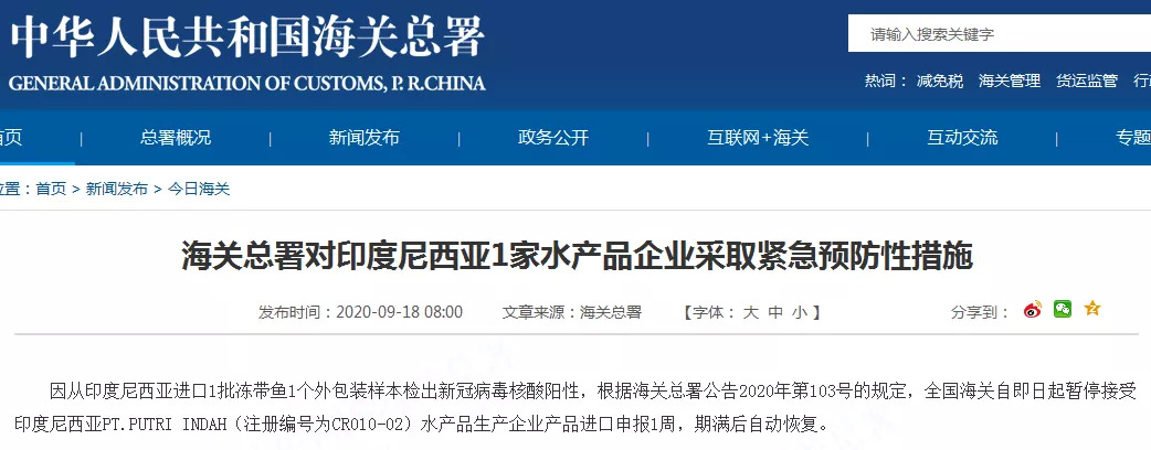 海关总署18日消息:因从印度尼西亚进口1批冻带鱼1个外包装样本检出新冠病毒核酸阳性,根据海关总署公告2020年第103号的规定,全国海关自即日起暂停接受印度尼西亚PT.PUTRI INDAH(注册编号为CR010-02)水产品生产企业产品进口申报1周,期满后自动恢复。
