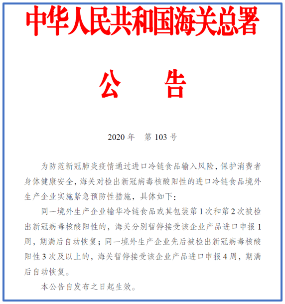 回顾:9月11日,海关总署发布2020年第103号公告《对检出新冠病毒核酸阳性的进口冷链食品境外生产企业实施紧急预防性措施的公告》: