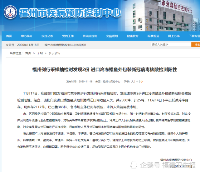 11月17日,疾控部门在对福州市某冷库进行常规例行采样抽检时,发现该冷库2份进口冷冻鲳鱼外包装新冠病毒核酸检测阳性。