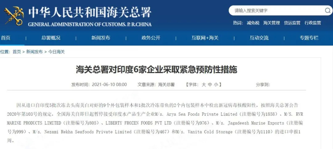 因从进口自印度5批次冻去头南美白对虾的9个外包装样本和1批次冷冻带鱼的2个内包装样本中检出新冠病毒核酸阳性,按照海关总署公告2020年第103号的规定,全国海关自即日起暂停接受印度水产品生产企业M/s. Arya Sea Foods Private Limited(注册编号为1858)、M/S. RVR MARINE PRODUCTS LIMITED(注册编号为805)、LIBERTY FROZEN FOODS PVT LTD(注册编号为976)、M/s. Jagadeesh Marine Exports(注册编号为999)、M/s. Nezami Rekha Seafoods Private Limited(注册编号为467)和M/s. Vanita Cold Storage(注册编号为1110)的进口申报1周。