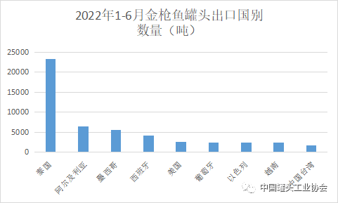 2022年1-6月,中国金枪鱼罐头出口的42个国家及地区中,出口量前九位的是:泰国,阿尔及利亚,墨西哥,西班牙,美国,葡萄牙,以色列,越南,中国台湾。