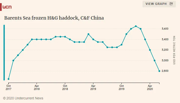 消息人士确认,近两个月真鳕与黑线鳕价格持续下跌,依不同产地,1-2公斤H&G(去头去脏)真鳕价格从年初的$4,500/t下跌至$3,650-$3,900/t,黑线鳕价格从年初的$3,600/t下跌至$2,700-2,900/t。