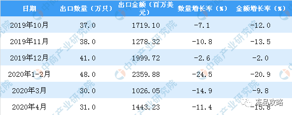 2020年初由于疫情影响各类产品出口都有所减少,2020年1-4月中国水海产品出口量为109万只,同比下降18.6%。