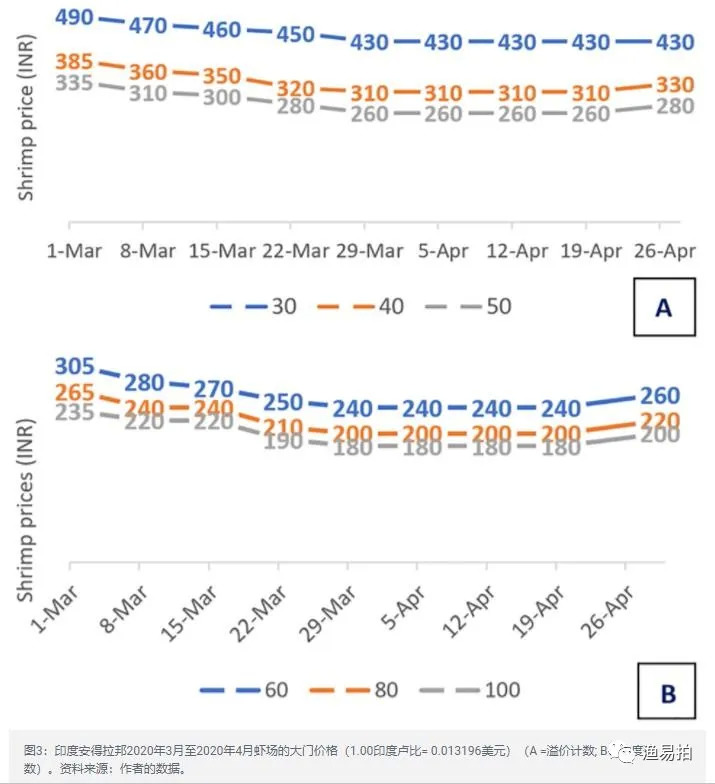 然而,2020年5月上旬,除30-40只这样的虾的价格下降了,其他规格的虾价格均有所上升。这可能是由于随着此前农民的恐慌性收割和库存的消耗,但大尺寸产品由于通常在饭店中广泛使用,而COVID-19大流行使得全世界有70%或以上的饭店仍处于关闭状态,所以价格仍处于下降趋势。此外,中等数量的虾可以出口到中国和从印度购买低数量(较小)虾的其他目的地,这些虾也可以被国内市场吸收。