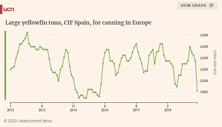 一位金枪鱼产业资深人士告诉UCN:“这种状况我生平从未见过!二月份还在€2,700/t的高位,市场瞬间崩盘简直不可思议。”