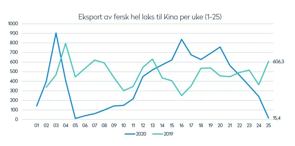 与去年同期相比,上周挪威向中国出口的新鲜鲑鱼减少了97%,至15吨。与今年的第24周相比,下降了94%。