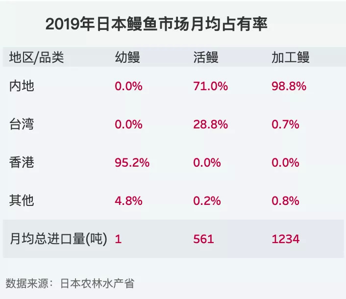 在上图中,我们还可以看见另一个内地全年霸榜的产品,那就是「调制鳗鱼」,即鳗鱼的加工制品。鳗鱼相关的产品有三类,除了调制鳗鱼,还有活鳗和幼鳗。再结合下图可以知道,我国两岸三地几乎垄断了日本的鳗鱼进口市场,常常把日本和美味鳗鱼饭联系起来的小伙伴是不是没想到呢!