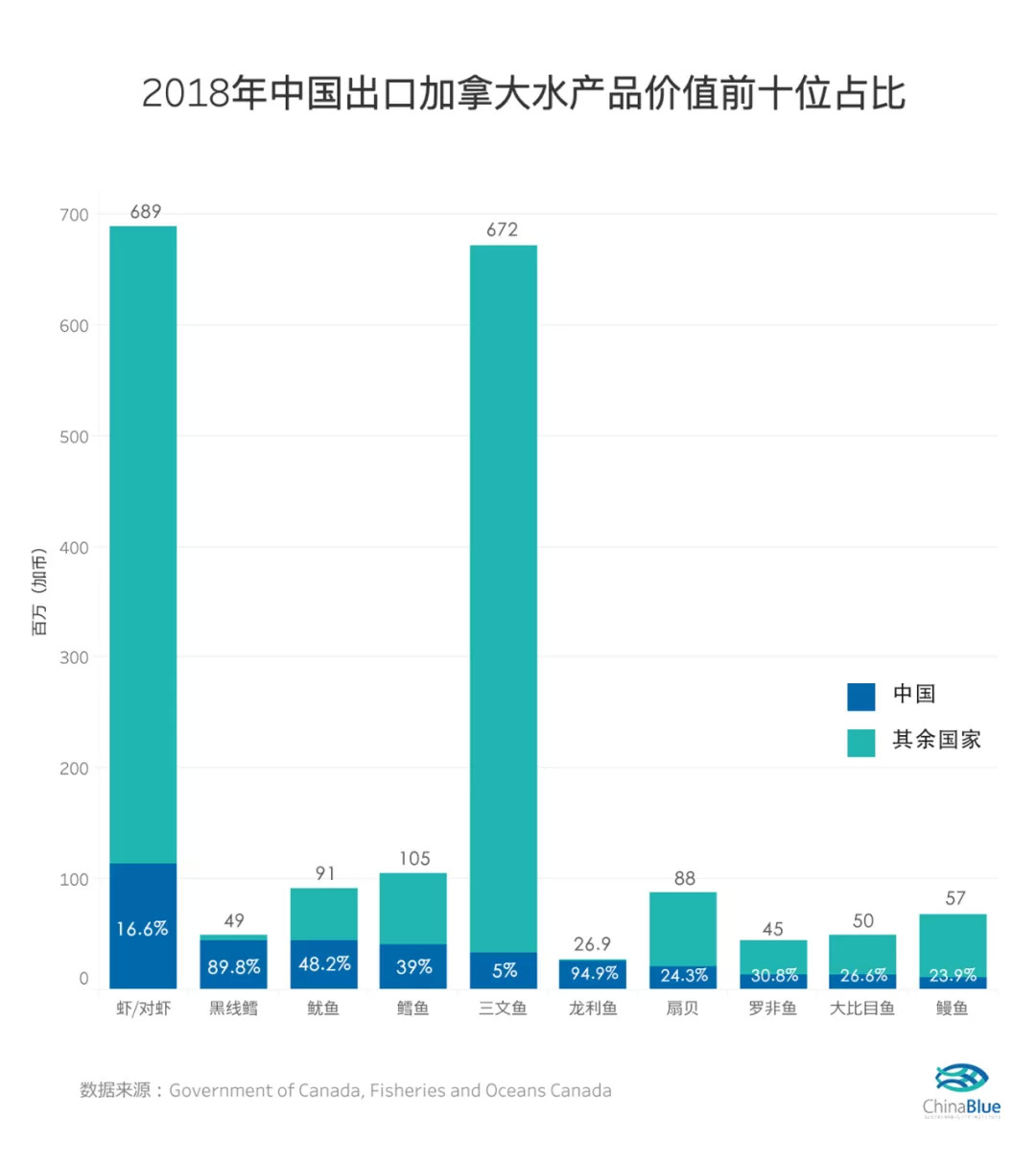 加拿大毗邻北冰洋、大西洋和太平洋,是世界第五大海产品供给国,主要出口到中国的有蟹类、龙虾类和虾类等产品;而中国主要出口到加拿大的海产品中,虾类出口量又仅次于越南和印度占据第三的位置。同时中国作为加拿大第二大海产品进口国(仅次于美国),约占加拿大进口总经济价值14%的市场份额。