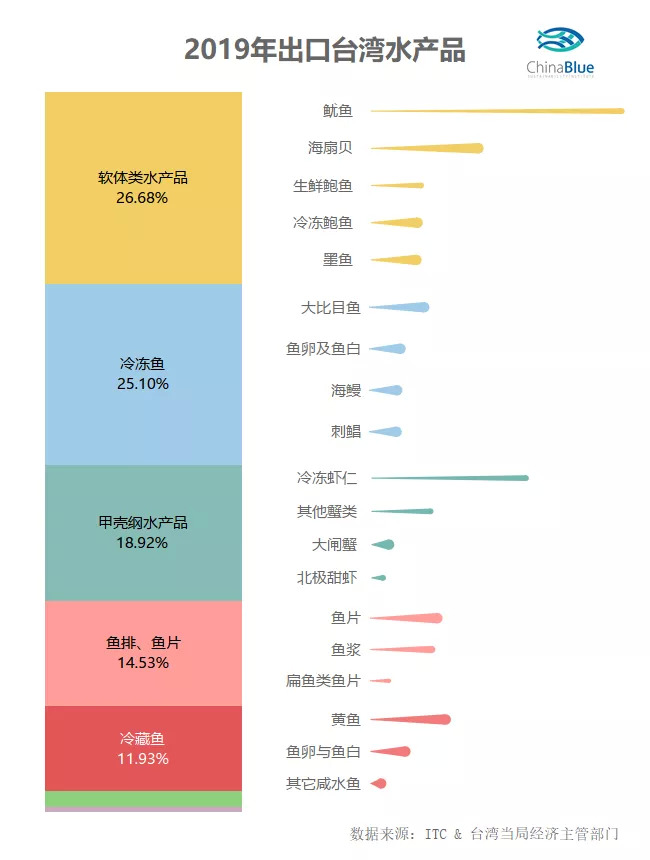台湾地区是中国内地输出水产品的主要目的地之一,位于我国出口的前十排行榜上。2019年,内地向台湾出口了总价值3亿美元的水产品。其中占比最高的是软体类水产品,占27%;位居第二的则是冷冻鱼,占25%。这些出口的水产品以冻品为主,比如,冷冻鱿鱼、虾仁、以及各种各样的鱼类海鲜。