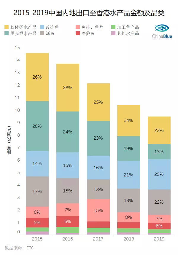 出口香港的水产品虽然占据了内地水产总出口量的很大一部分,但通过上图不难发现,近几年的出口金额也在逐渐降低。由2015年将近15亿美元逐年减少到去年的8亿美元,且变化最为明显的种类应属甲壳纲水产品,例如虾类和蟹类。