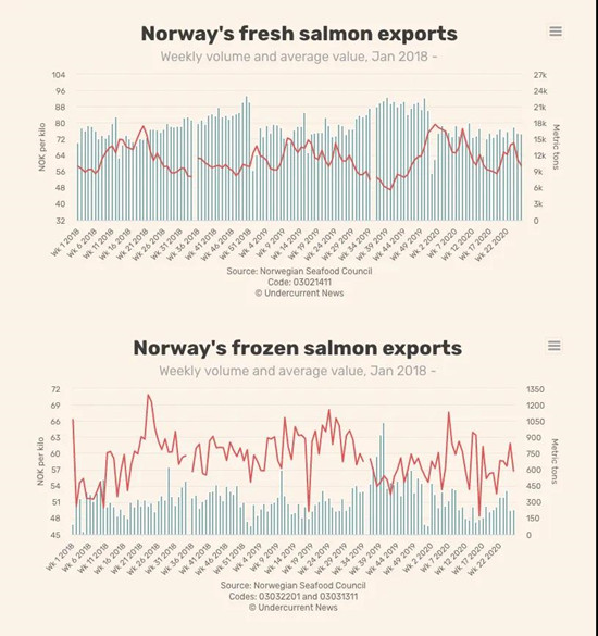 挪威海产局(NSC)统计,第26周冰鲜与冷冻三文鱼的出口额再次下降,降幅分别为5%、8%。