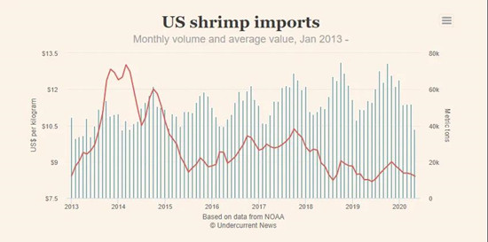 事实上,五月份的数据也创下七年以来单月进口的最低值,2013年六月份,美国进口33,940吨虾产品,货值3.21亿美元。