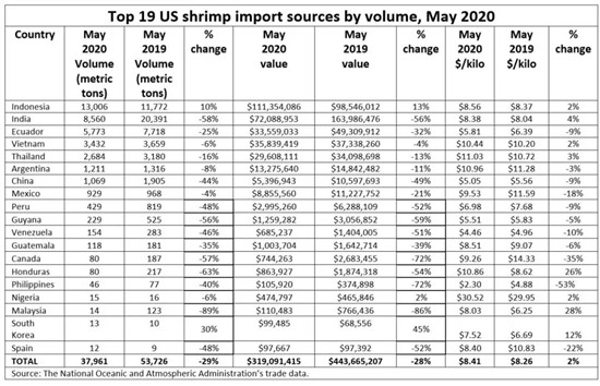 NOAA统计,五月份没有进口约3.8万吨虾产品,同比下降29%,印度市场地位被印尼取代。