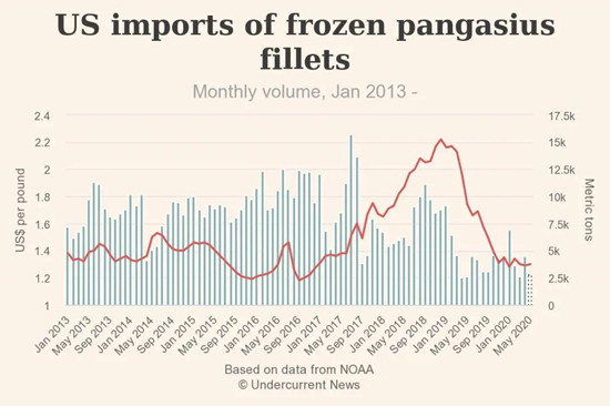 美国国家海洋与大气管理局(NOAA)统计,2020年5月份美国进口2,787吨冷冻巴沙鱼鱼片,较4月份(4,508吨)下降40%,但相比2019年同期,进口量增长7%左右。