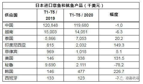 根据越南海关的数据显示,2020年5月越南对日本的鱿鱼和章鱼出口额同比下降了44%。2020年1-5月,越南鱿鱼和章鱼向该市场的出口额超过4800万美元,同比下降22%。日本是越南鱿鱼和章鱼的第二大进口市场。占越南鱿鱼和章鱼向市场出口总值的25%。