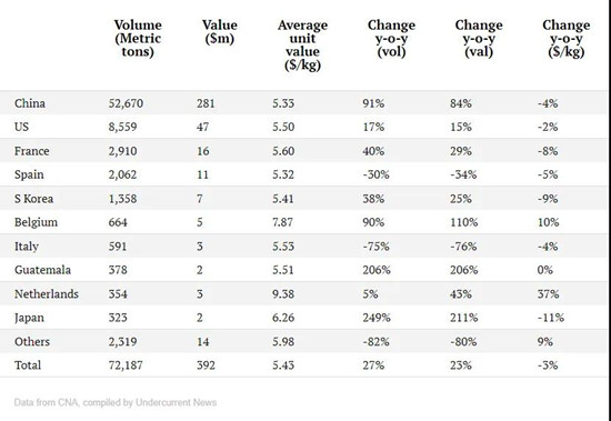其中,出口中国的数量达到52,670吨,排名第一;美国市场出口量8,500吨,排名第二;排名三、四位分别为法国(2,910吨)和西班牙(2,062吨)。