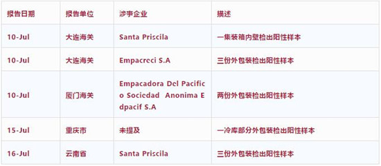 7月10日,中国海关总署称在部分厄瓜多尔虾产品外包装及一个集装箱内壁检出新冠病毒,暂停三家厄瓜多尔虾企(Santa Priscila、Empacreci、Empacadora Del Pacifico Sociedad Anonima Edpacif)进口资质。
