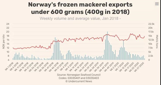 今年以来,挪威鲭鱼出口大幅增长,同比增幅超过50%。据挪威海产局(NSC)统计,2020年1月1日至7月12日,600g以下挪威冷冻鲭鱼的出口数量达到117,029吨,较去年同期增长63%。