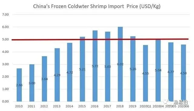 与进口量的持续迅速增长形成对比的是:2020年6月中国进口冷冻北极虾的价格有所下降,与2019年同期相比下降了20%,降至每公斤4.58美元,仅仅比2020年1季度的最低价4.55美元略高。