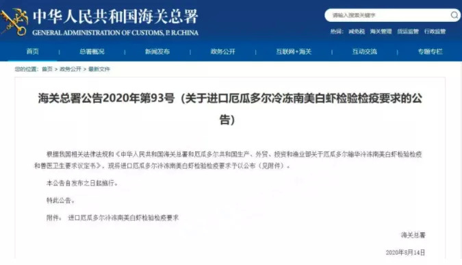 海关总署2020年的第93号令中公布了关于进口厄瓜多尔冷冻南美白虾检验检疫要求。