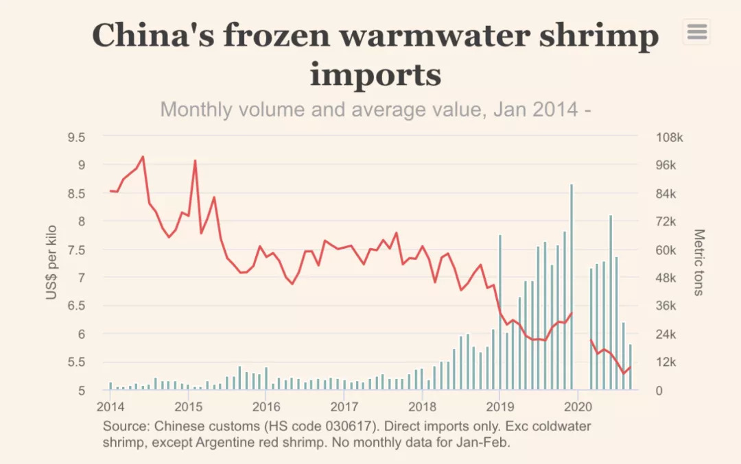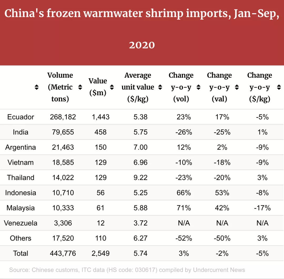 今年前三季度,中国进口44.4万吨冷冻暖水虾,较上年同期增长3%,进口额25.5亿美元,较上年同期下降2%。