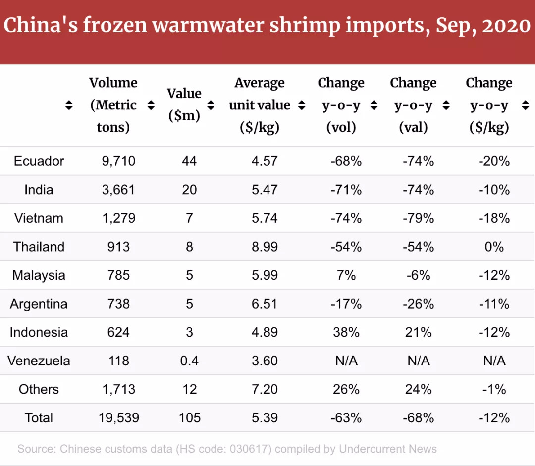 厄瓜多尔出口数据显示,8月份对华销量提升至1.3万吨,9月份增至2.16万吨。某大型进口商告诉UCN,厄瓜多尔白虾进口要彻底恢复正常,还需数月时间。