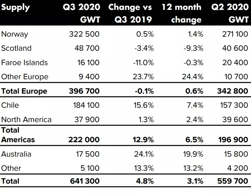 报告中分析,第三季度全球大西洋鲑产量达到64.3万吨,同比增长5%,主要由智利产量增长(16%)带动;智利冷冻三文鱼库存增加8,000吨,预计智利冷冻库存量在5.5-6.5万吨之间。
