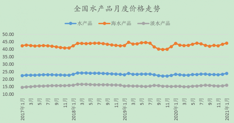 1月份,海水产品价格44.21元/公斤,环比上涨1.69%,同比上涨0.41%。