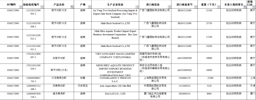 其中,因“检出动物疫病”未准入境虾类163.379吨: