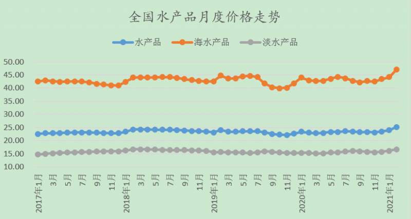 2月份,海水产品价格47.03元/公斤,环比上涨6.37%,同比上涨9.49%。