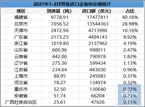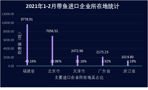 1-2月份带鱼进口企业所在地前三省市为: