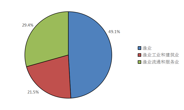 按当年价格计算,全社会渔业经济总产值27543.47亿元,其中渔业产值13517.24亿元,渔业工业和建筑业产值5935.08亿元,渔业流通和服务业产值8091.15亿元,三个产业产值的比例为49.1:21.5:29.4,如图1所示。渔业流通和服务业产值中,休闲渔业产值825.72亿元,同比下降14.32%。