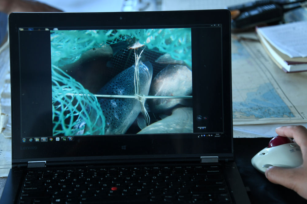 ↑工作人员在播放“深蓝1号”网箱水下画面,网箱中大概有10万尾左右的大西洋鲑(6月7日摄)。