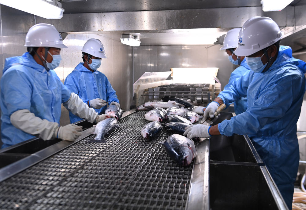 ↑6月8日,养殖工船上的工作人员在加工收获的大西洋鲑。新华社发(俞方平 摄)