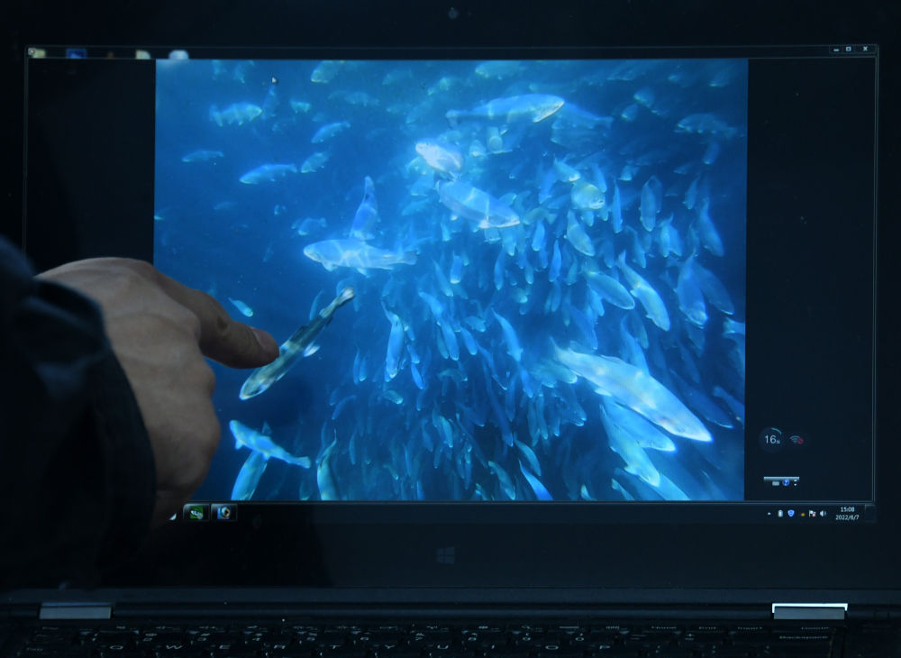 ↑工作人员在播放“深蓝1号”网箱水下收鱼画面,收鱼采用吸泵捕鱼方式,通过管道将鱼吸上养殖工船(6月7日摄)。