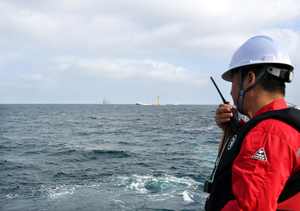 ↑工作人员登上“深蓝1号”准备进行收鱼作业(6月7日摄)。新华社记者 李紫恒 摄