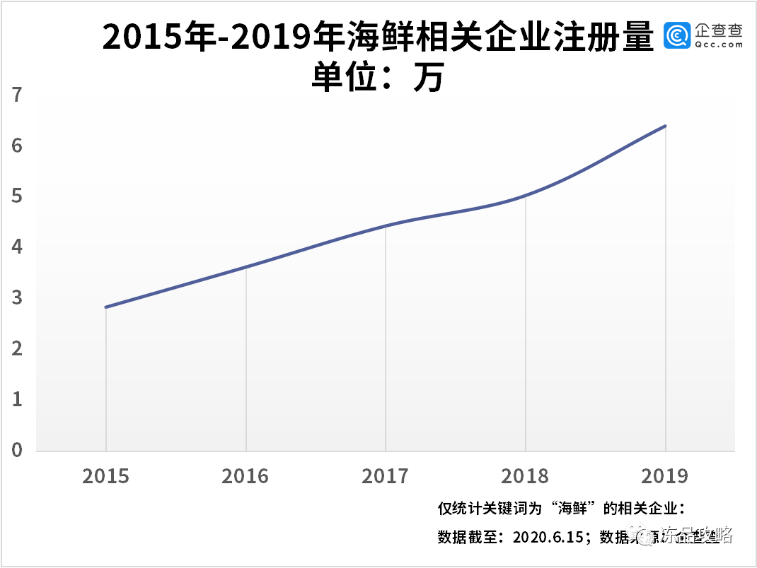 从海鲜相关企业注册量来看,2015年开始的五年来,海鲜相关企业注册量稳步增加,2015年共注册2.83万家。2019年,相关企业的注册量和新增速度都达到了最高点,共6.40万家,同比增长27.2%。
