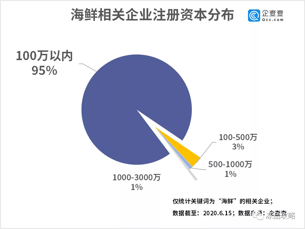 从注册资本来看,大部分海鲜相关企业注册资本都集中在100万元以内,占比高达95%。注册资本在100-500万元的企业数量居于第二,仅为3%,远少于第一名。从企业类型来看,个体户的比例非常高,达34.59万家,占比88%。