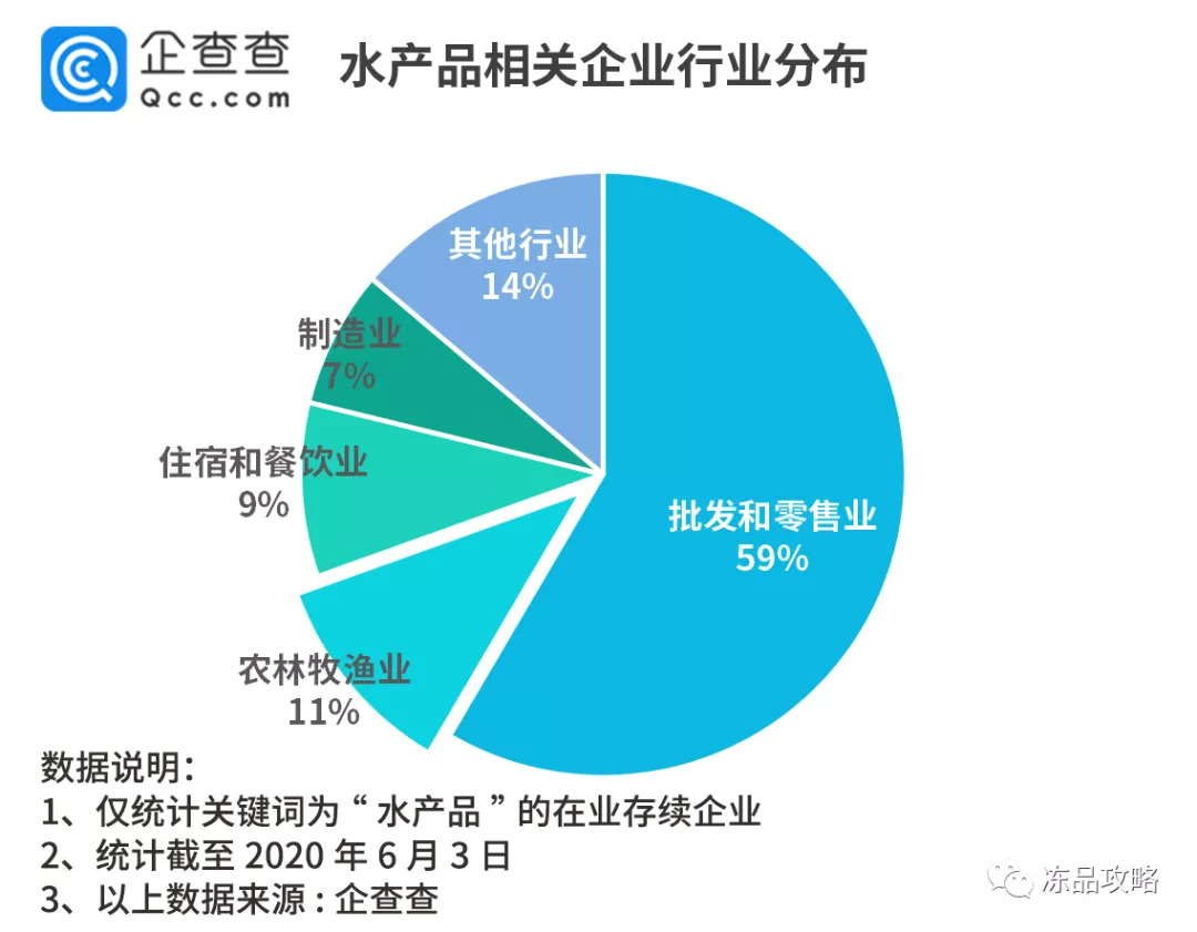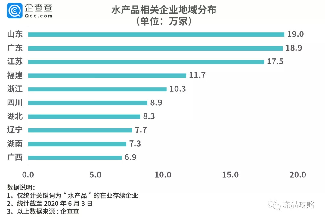 从行业分布来看,水产品相关企业主要集中于批发和零售业,占比近60%,作为农业基础行业的水产行业,其相关公司分布在农林牧渔业的数量仅有11%。第一产业并不是水产品的发展方向,近几年水产饲料、水产加工、包装水产品等周边行业的迅速发展,让水产品行业生生不息,焕发出别样的生命力。