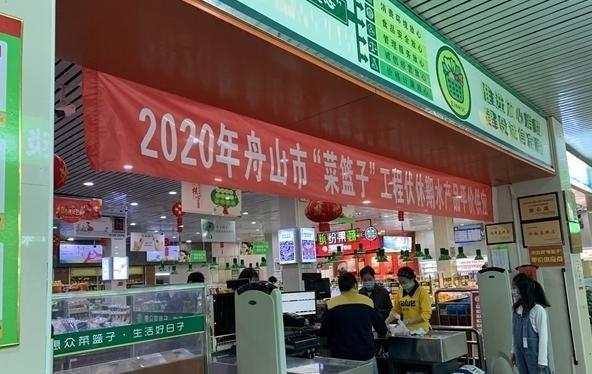 5月1日上午,记者在舟山市菜篮子服务有限公司桔园菜场直供店看到,进门显眼的位置挂上了平价供应的横幅,在休渔期间进行平价供应。
