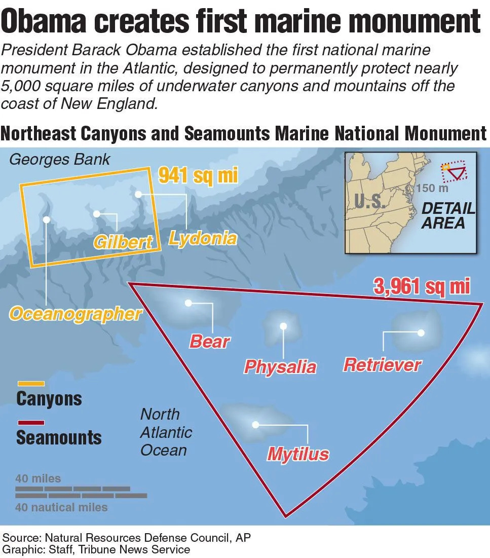 6月5日,美国总统特朗普访问缅因州,并签署一项公告,宣布解除东北峡谷和海山国家海洋保护区(Northeast Canyons and Seamounts Marine National Monument)的渔业禁令,允许新英格兰地区的商业渔船执行捕捞作业,立即生效。