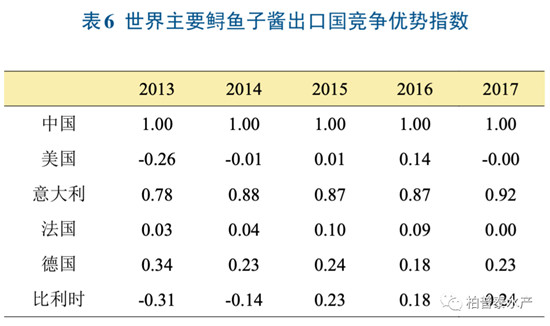 从表6可以看出,中国的贸易竞争指数自2013年以来一直维持在1.0,原因在于中国鲟鱼子酱进口量非常低,出口量远大于进口,是鲟鱼子酱的净出口国,在国际贸易上表现为顺差,具有很强的国际竞争力。同样具有较强国际竞争力的是意大利,其次是德国和比利时。通过对3个指标的分别测算分析表明,当前中国鲟鱼子酱的国际市场占有率居世界首位,具有比较强的国际竞争力。