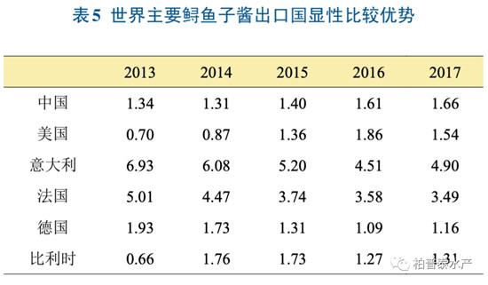 从表4可以看出,2013年以来中国鲟鱼子酱的国际市场占有率不断提升,2015 年以后更是超越意大利,成为全球鲟鱼子酱出口市场占有率第一的国家,并一直保持至今,说明中国鲟鱼子酱出口市场不断在扩大,在国际市场上具有显著竞争力。