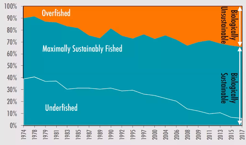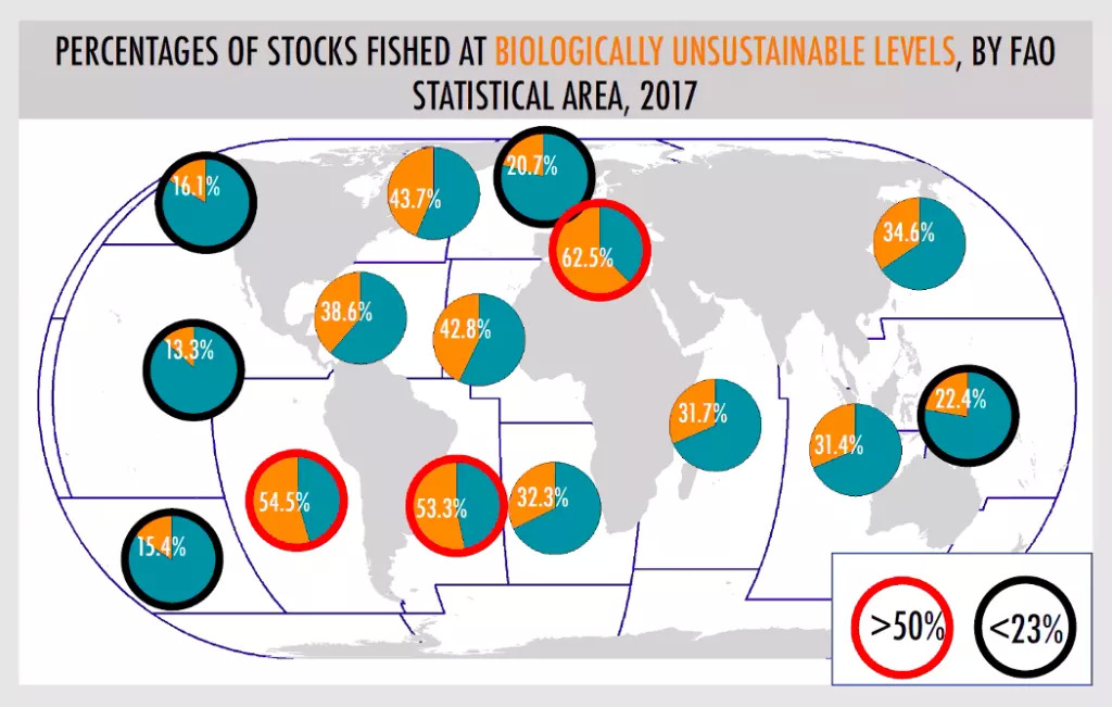 FAO渔业与水产养殖司司长Manuel Barange称,全球鱼类资源的可持续水平从1974年的90%下降至2017年的65.8%,根据2018年的调查,地中海、黑海、太平洋东南海区、大西洋西南海区仍是过度捕捞最严重的地区,但太平洋东南海区和大西洋西南海区已有明显改善。