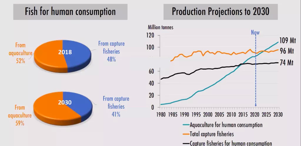 FAO预测,2030年全球捕捞渔业年产量逼近9,600万吨,水产养殖产量增至1.09亿吨,供人类食用的鱼类蛋白中,养殖水产品的占比将增至59%。