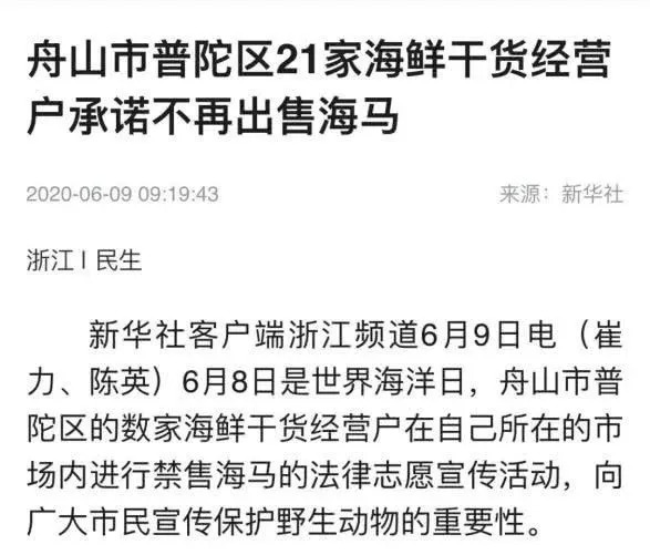 昨天,新华社客户端以《舟山市普陀区21家海鲜干货经营户承诺不再出售海马》为题,刊登普陀区检察院相关工作。