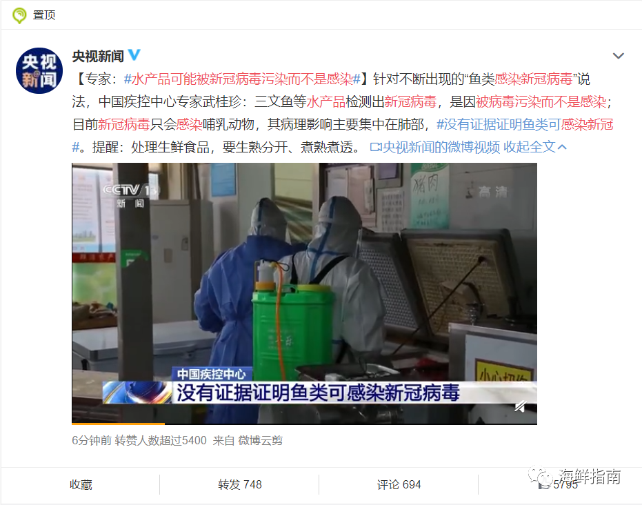针对不断出现的“鱼类感染新冠病毒”说法,中国疾控中心专家武桂珍:三文鱼等水产品检测出新冠病毒,是因被病毒污染而不是感染;目前新冠病毒只会感染哺乳动物,其病理影响主要集中在肺部,没有证据证明鱼类可感染新冠。